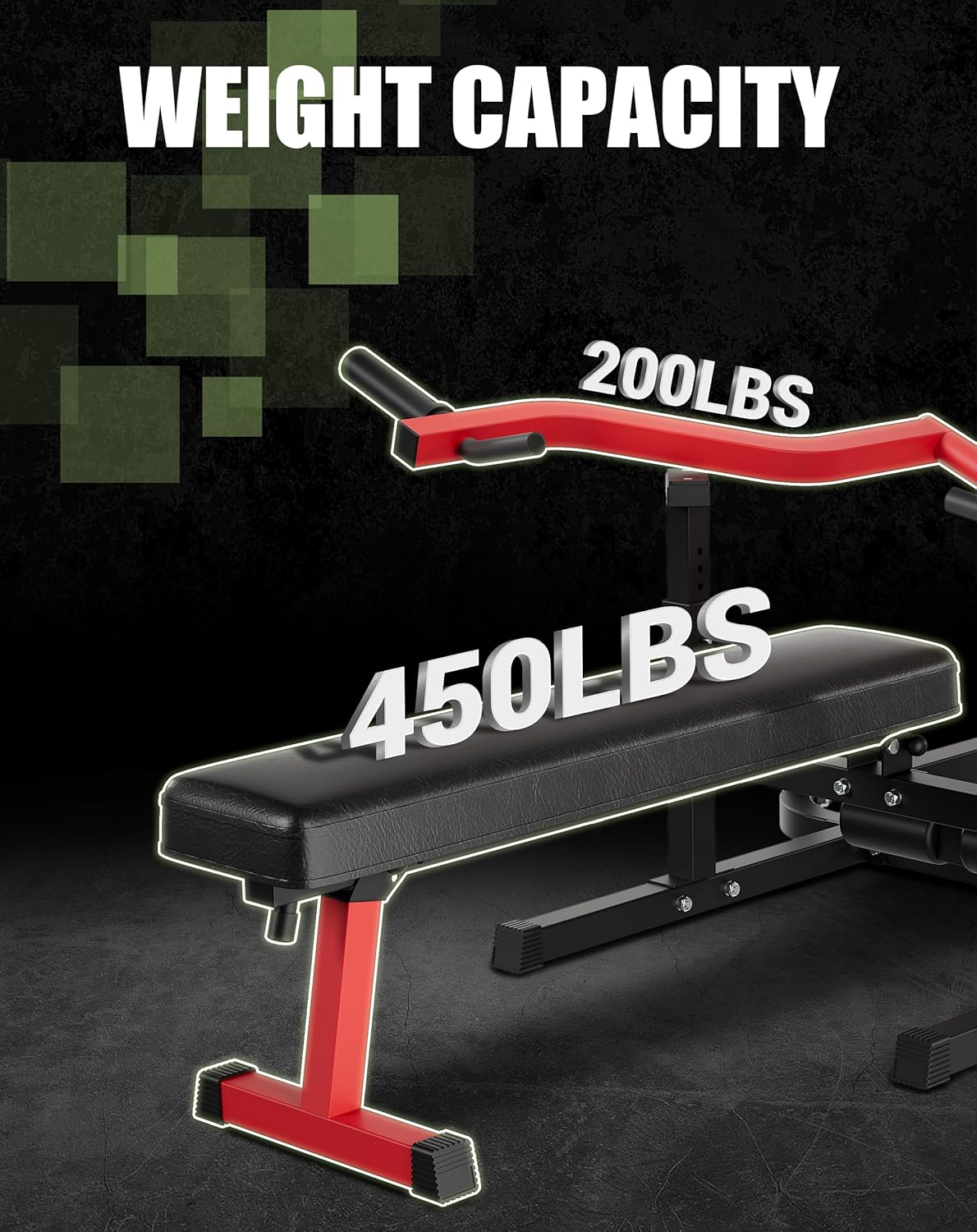 - Sturdy Construction: Built with heavy-duty carbon steel and a triangle structure, this chest press bench supports users up to 1050 lbs, with 450 lbs on the flat bench, 200 lbs per arm, 200 lbs per weight storage, ensuring stability during workout